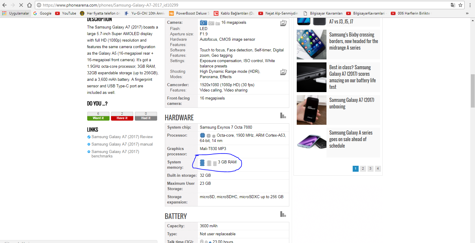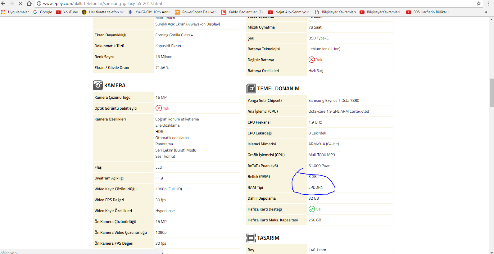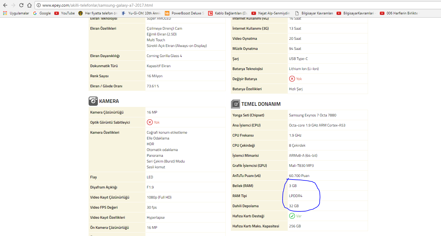 Sıkıntı şu ki yanlış yazıyor. A5 2017 ile A7 2017 ekran boyutu ve batarya miktarı dışında tamamen aynı cihazlar.Her yerde LPDDR4 yaziyor