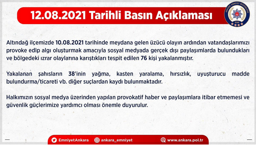Bu arada Emniyetten Resmi açıklama geldi. Dün halkı galyane getiren yalan yanlış bilgiler haberler yayın insanları kışkırtan 76 kişi yakalanmış.