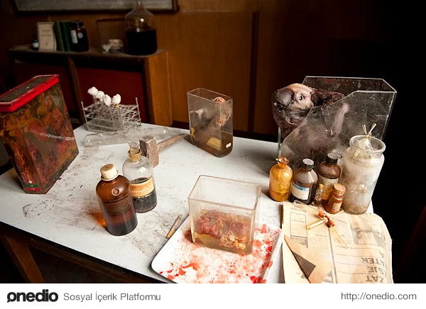 Binada bulunan kavanozlardaki hayvan örnekleri, küflenmiş malzemeler ve şırıngalar gibi veterinerlik araç gereçleri görenlerin tüylerini ürperten cinsten.