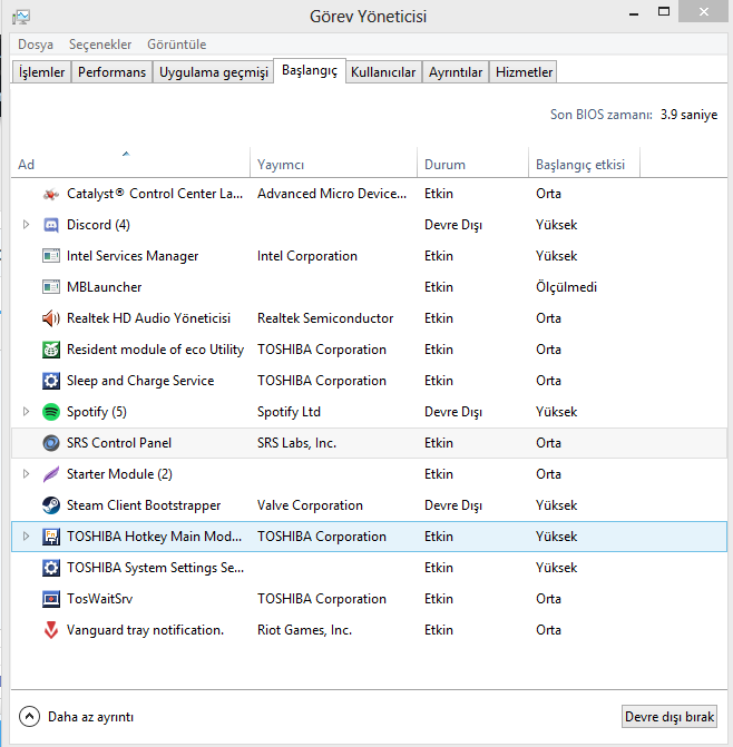 ozaman SRS conrol panel i kapıyomYayıncı Advanced Micro Devices, Intel, TOSHIBA dışında olanları kapatabilirsiniz. (Valorant'ı kapatırsanız oyunu açarken yeniden başlatmanız gerekir.)