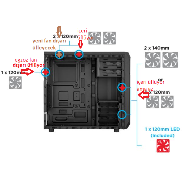 Merhaba arkadaşlar, yaz aylarındanmı bilmiyorum bilgisayar felaket ısınıyor, kasada 3 tane fan mevcut, fan almayı düşünüyorum. Bir de kasanın hava akımı mevzusu var pek anlamıyorum, Resimdeki fotografta sol taraftaki fan egzoz görevini görüyor, yukarıdaki fan içeri üflüyor, sağ tarafta bir fan daha var, gözükmüyor ancak oda içeri üflüyor, ama ben üflesem daha yararlı olur az üflüyor. Bir kasa fanı daha almaya karar verdim yukarıya takmayı düşünüyorum. Nasıl yapabilirim? egzoz fanmı yapmalıyım?, yoksa içerimi üflemeli? Teşekkürler.