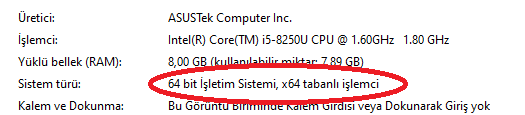 bilgisayarımın 64 bit olup olmadığından emin değilim ama özelliklere bakınca çıkan sonuç bu;