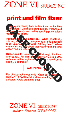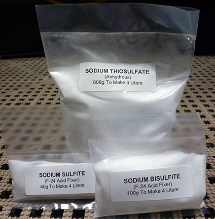 Klasik sabitleme maddesi, fotoğrafçılıkta "hipo" olarak bilinen Sodyum Tiyosülfat'tır. Tek başına işe yarar, ancak çözeltisi uzun süre dayanmaz, bu nedenle kararlılığını artırmak için banyonun asitlendirilmesi gerekir. Bu amaçla Potasyum Metabisülfit kullanılır. Formülü Adox F33'tür: