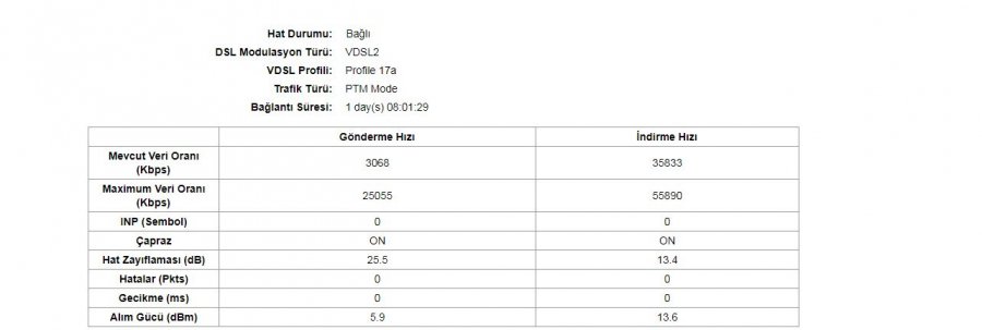 Ulaşılabilir Hız(Kb/s):51448/12584SNR Sınırı (dB):19.314.7
