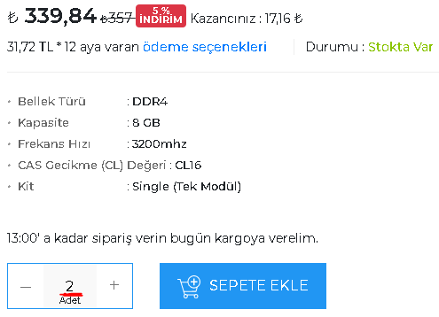 Hayırlı olsunToplam -_->> 2,968 TL. RAM'leri 2 tane seç.