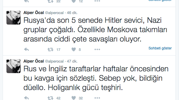 Alper Öcal'ın twitterda yazdıklarına göre "Rus ve İngiliz taraftarlar haftalar öncesinden bu kavga için sözleşti. Sebep yok, bildiğin düello. Holiganlık gücü teşhiri. Rusya'da son 5 senede Hitler sevici, Nazi gruplar çoğaldı. Özellikle Moskova takımları arasında ciddi çete savaşları oluyor."