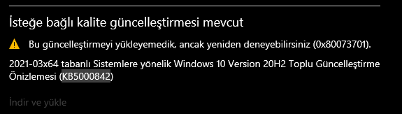 Öncelikle merhabalar bilgisayarımdan Windows Update'den KB5000842 güncellemesini yapmak istedim fakat fotoğrafta da olduğu gibi güncelleme yüklenemiyor bilgisayarıma yeniden başlatma yapsam tekrar tekrar güncellemeyi denesem de düzelmedi herhangi bir bilgisi olan varsa bana yardımcı olursa sevinirim.