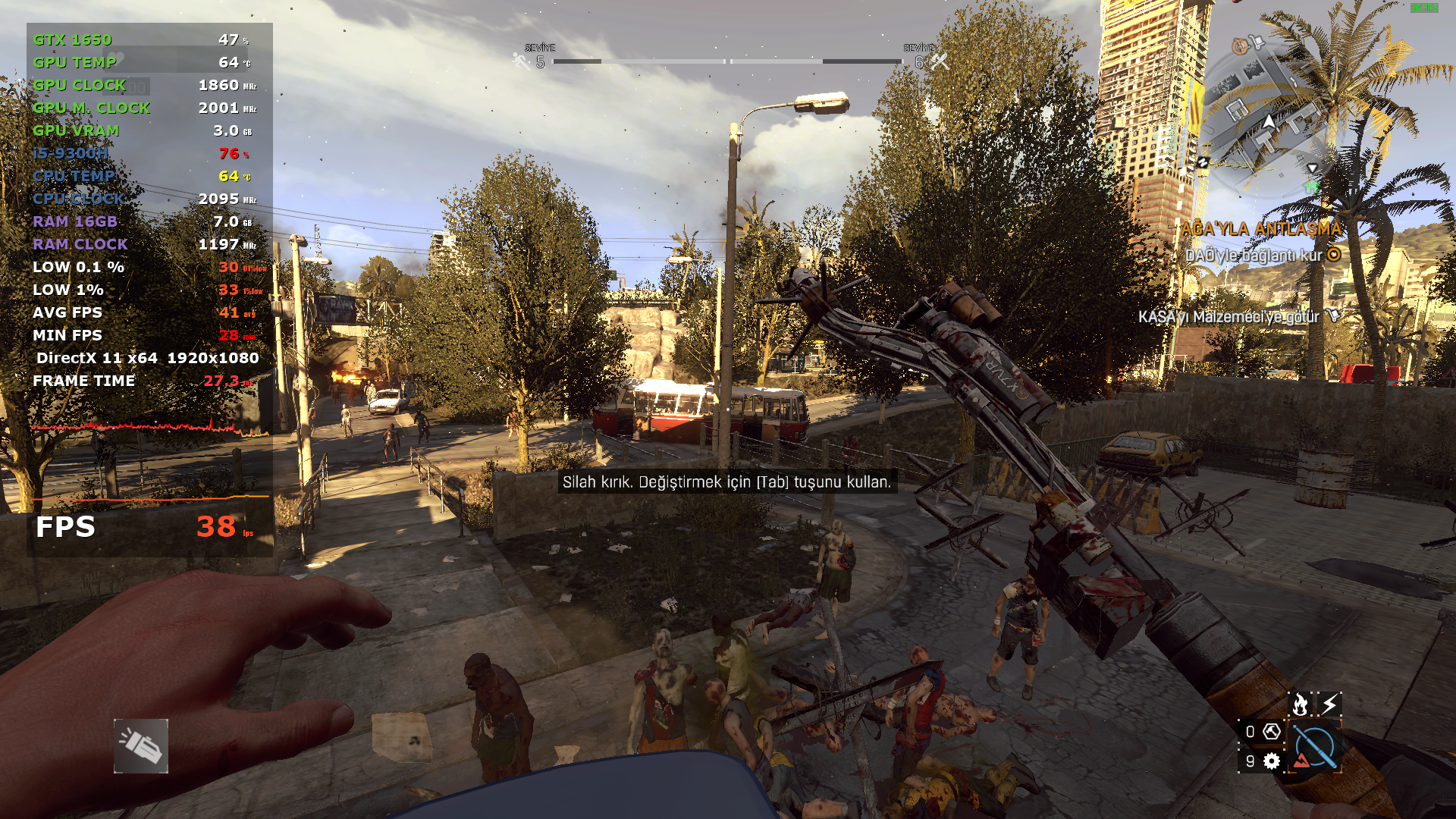 Ek olarak Dying Light oyunu. Oyuna bazen giriyorum Ultra ayarlarda 80-90 FPS değerlerinde gayet akıcı bir şekilde oynayabiliyorum. Yarın olsun veyahut 1-2 saat sonra olsun tekrar giriyorum, en düşük ayarlarda bile 40 FPS zor alıyorum. Dying Light oyununa ait bazı görseller ektedir.