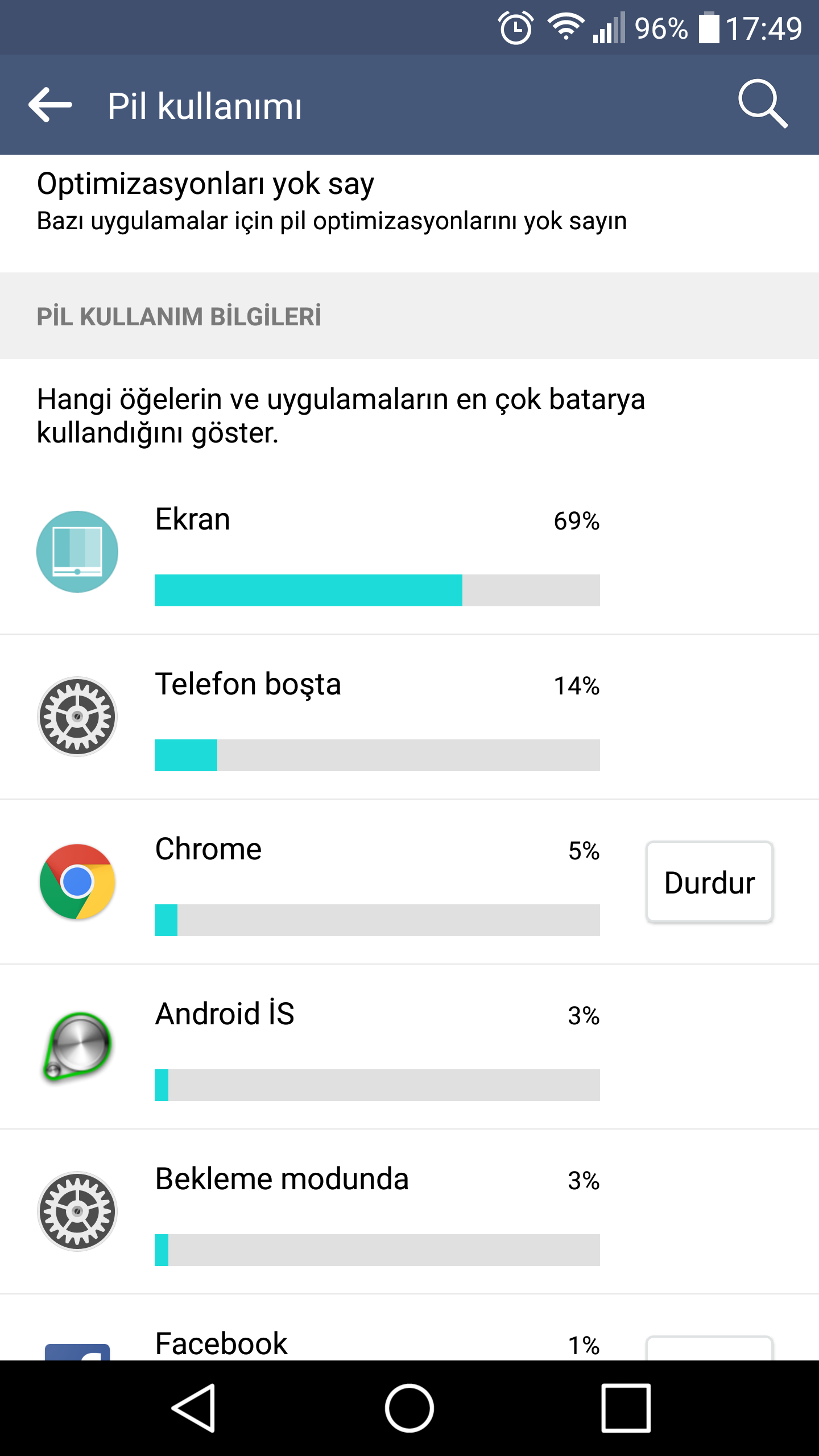 Sadece ekran açıp bıraksan bir köşede, o ekran değeri %99 olur. Çünkü ekrandan başka şarj yiyen bir şey olmayacak. Belki arayüz tüketir bir miktar.