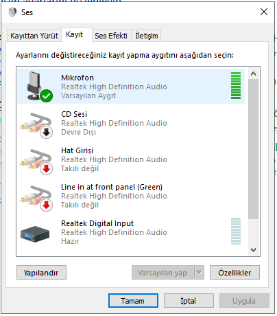 Başlat’a tıklayıp mmsys.cpl Yazarak Enter’a basın.
