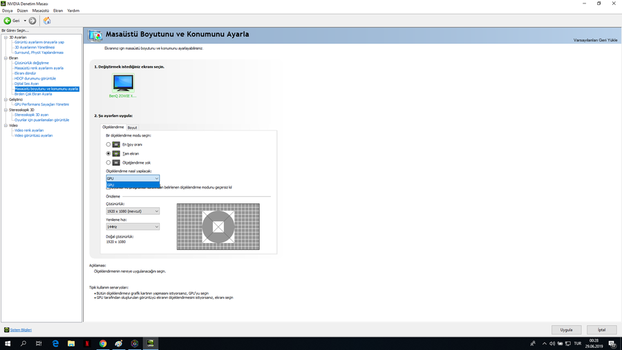 iyi günler nvidia denetim masasında eski mönitörümü hdmi ile bağlarken ölçeklendirme nasıl yapılacak kısmında ekran vardı fakat yeni monitör aldım ve Displayport ile bağladığımdan beri ekran seçeneği çıkmıyor fotoğrafta görebileceğiniz üzere sadece GPU çıkıyor ve bu fps düşüşüne yol açıyor ekran seçeneğini nasıl geri getiricem? Başka kablo kullanamama çünkü displayport 144 hz veriyor sadece.
