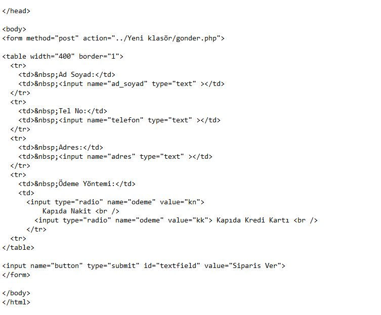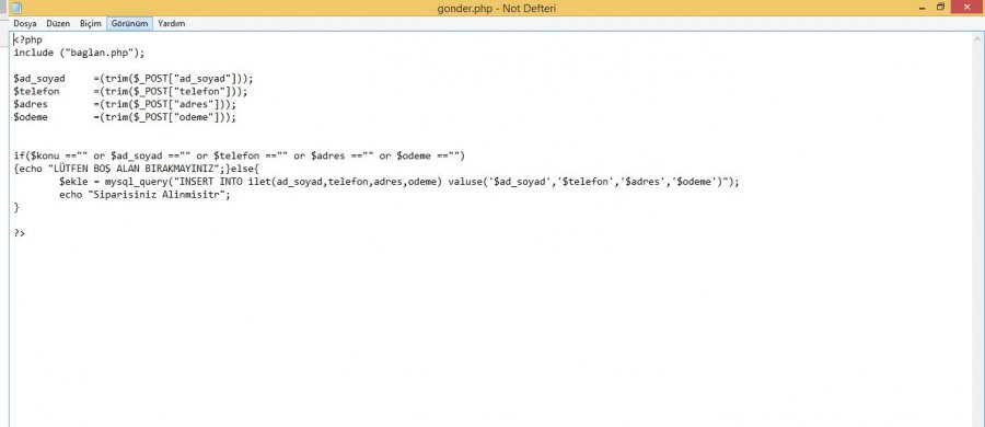 Yazmaya çalışdığım php sipariş formunda bir hata var ve bulamıyorum,formu denerken sipariş ver butonuna bastığım zaman gonder.php açılıp beyaz bir ekran geliyor ve bilgiler veri tabanına kaydolmuyor lütfen yardım edin: