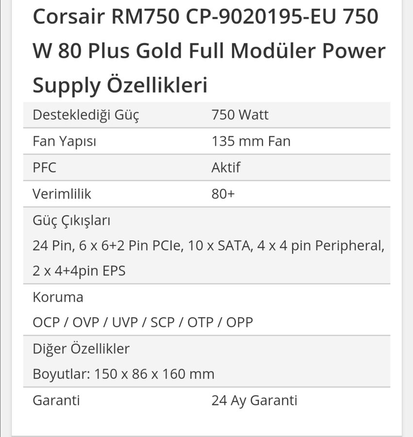 Corsair RM750 CP-9020195-EU 750W Power Supply modeli bu internette 5 yıl yazıyor. Ondan sordum. Yinede bir daha kontrol edeyim hem internnetten hem cihazın kutusundaki belgeden.