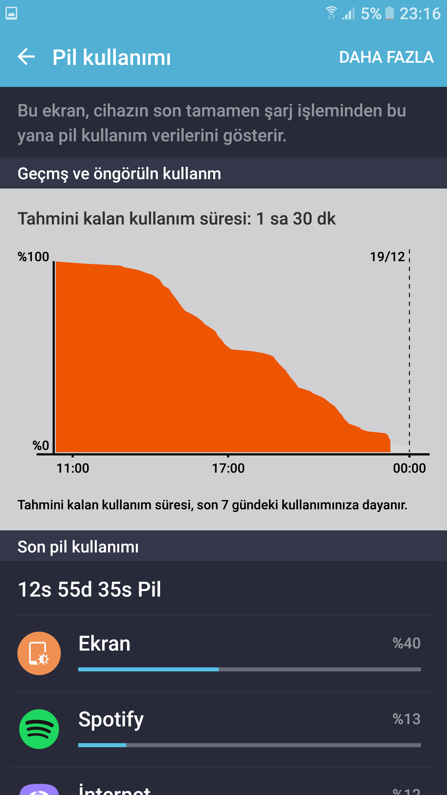Normal hocam ben bile 4g ile 4 saati zor görüyorum. Oyunda oynamam sırf sosyal medya..Arkadaşlar dün hepsiburada dan ithalatçı garantili Note 5 aldım. Şarjı bitene kadar kullandım. Sonra da orijinal şarj aletini paketten çıkan dönüştürücüye (evo marka) bağlayıp kapalı olarak şarj ettim. 1.5 saat içinde doldu. 40 dakika daha bekleyip çektim şarjdan. Ama 2-3 dakika sonra 99 a düşüyor. 3-4 saat anca kullanım sonunda şarj bitiyor. 2 defa hızlı şarj bir defa da yavaş şarj ettim. Değişen bir şey yok. 3g ile kullanıyorum cihazı. iPhone 7 Plus ta kullandım onda 1 günü görüyordum. Acaba batarya mı bozuk? Yada şarj aleti mi sorunlu?