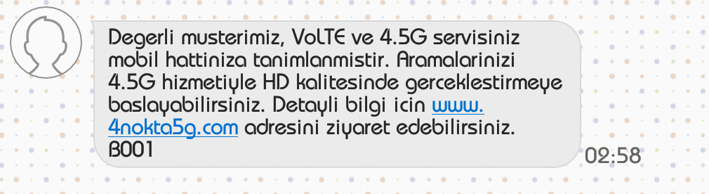 Bulunduğum yerde 4.5 g bir çekiyor bir çekmiyor H ye geçiş yapıyor. O geçiş esnasında telefon konuşması yaparken hattan düştüm bazende tam arama yaparken. Bir seferde tam karşı taraf telefonu açarken düştü.Bende bu mesajı aldım bir kaç dakika sonra h