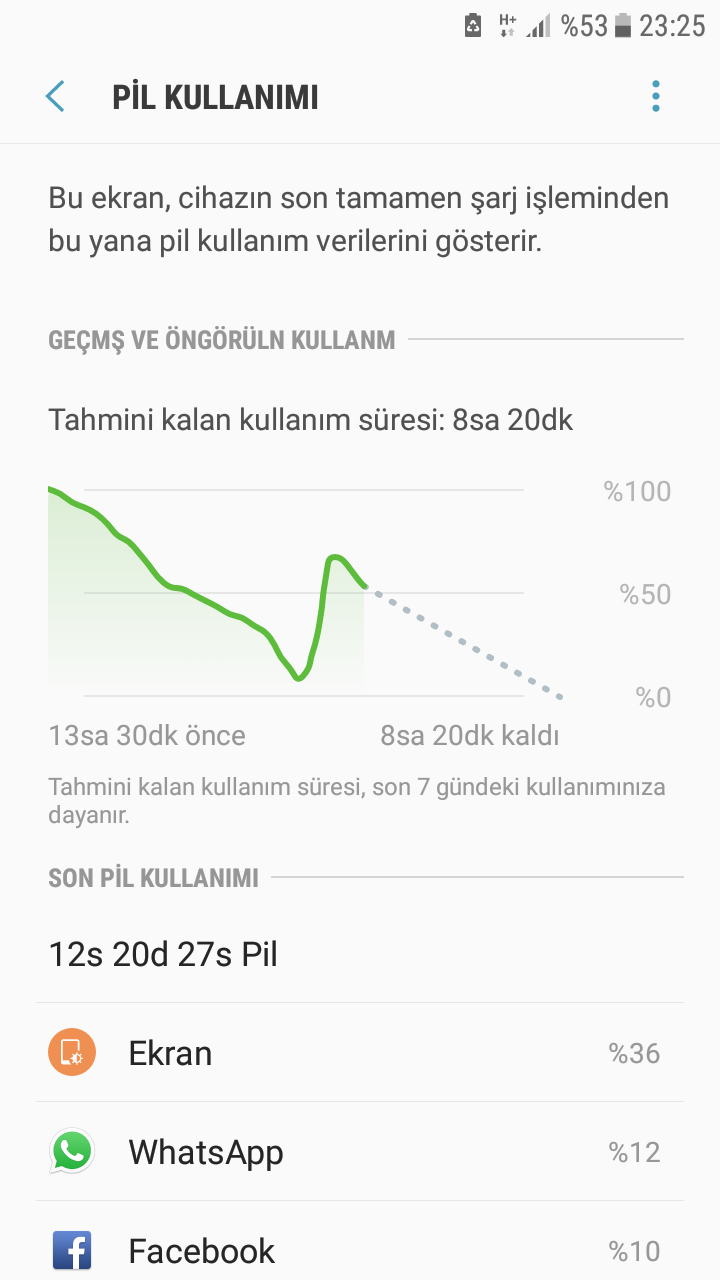 telefonu servise verdim pil değişti ama yine aynı full şarjdan sonra 10-15 dakikda %99 a düşüyor hiç kurcalamadan saat 15 00 de şarjdan çektim saat 19:30 ve şarjı %88 e indi sadece wifi açık whatsapp açık arkada çalışan uygulamalarda internetten çekenler kapalı normalmi