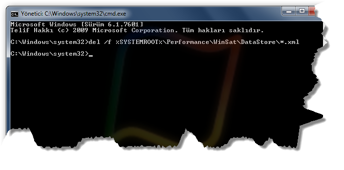 2- Komut sitemcisine del /f %SYSTEMROOT%\Performance\WinSat\DataStore\*.xml komutunu girin ve Enter'a basın.