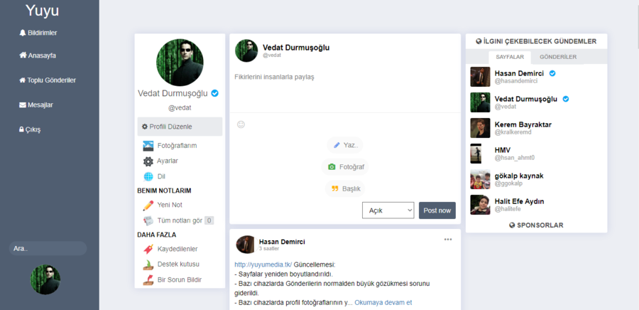 Hayırlı olsun nice kullanıcılara ulaşırsın inşallahHenüz daha yolun başlarında olduğumuz yeni sosyal medya sitemizi kurduk daha bugün beta sürümünü açtık ve aklımıza yeni fikirler geldikçe hobi amaçlı geliştiriyoruz, buraya yazma amacım sadece sizlerin düşüncelerini de merak etmem benimle paylaşırsanız sevinirim.